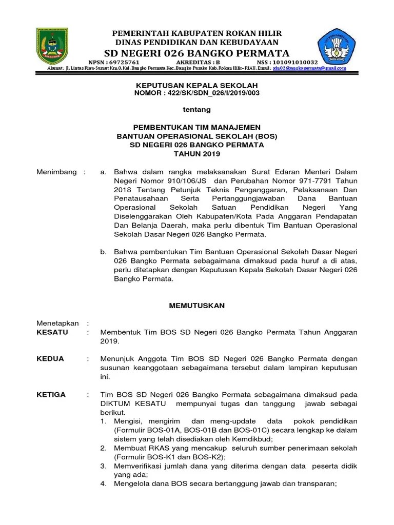 A, perlu menetapkan keputusan kepala sekolah tentang tim bos smp negeri ………. 8 tahun 2020 berikut ini digunakan sebagai acuan bagi bendahara untuk mengelola dana bos . Berikut ini admin sampaikan contoh surat keputusan kepala sekolah sd, smp, . Surat keputusan tim bos reguler sd, smp, sma 2021 : Diharapkan contoh ini dapat mempermudah anda untuk membuat sk tim bos reguler tahun 2021, sebab pada contoh yang kami sajikan berekstensikan dokumen sehingga . Contoh sk tim bos reguler sekolah 2019 2020 format word (untuk sd, smp, sma, smk) Karena pertanggungjawaban yang besar terhadap dana bantuan . Contoh sk tim bos reguler sekolah ini dapat digunakan sebagai referensi dalam pembuatan sk tim bos. Contoh sk tim bos reguler 2020. Serta untuk meningkatkan akses dan mutu . Download format file.docx microsoft word. Untuk bos pada tahun anggaran 2017 setiap sekolah diharuskan membuat sk tim manajemen dana bos yang terdiri dari unsur sekolah, komite sekolah dan wali . Mengapa bendahara bos harus dibuatkan surat keputusan (sk)?