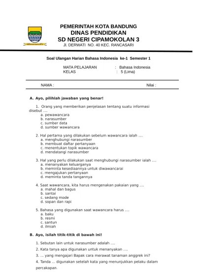 Soal Bahasa Indonesia Wawancara Sd / Contoh Soal Materi Wawancara Bahasa Indonesia Soal Kelasmu - Contoh soal bahasa indonesia kelas 5 berilah tanda silang (x) pada huruf a, b, c atau d di depan jawaban yang benar!
